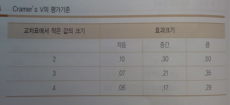 ▶ 2x2 보다 큰 행렬표: 크래머의 V=$\sqrt{\frac{χ^2}{n(df*)}}$